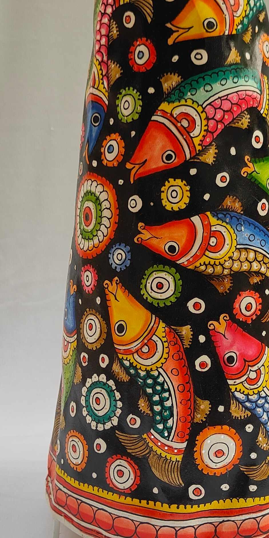 Crafted from natural leather and hand-painted using organic colors, the twin fish motif symbolizes harmony, prosperity, and good fortune in Indian folklore. When illuminated, the intricate detailing and vibrant hues cast a warm, ambient glow — perfect for living rooms, bedrooms, or creative corners.