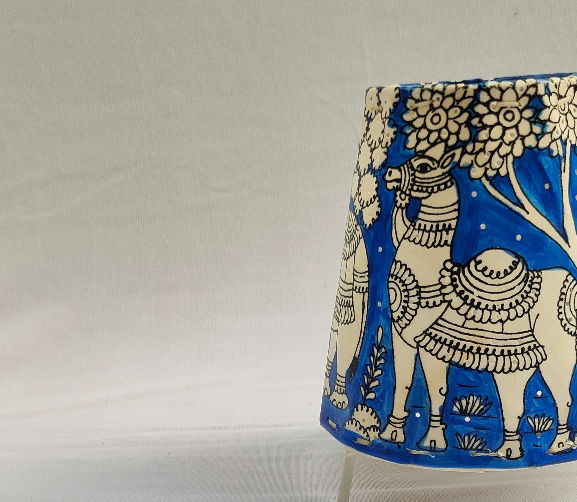 Brighten your space with the charm of traditional craftsmanship! This 5-inch handcrafted leather lamp features beautifully detailed animal motifs inspired by the rich heritage of Nimmalakunta’s Tholubommalata leather puppetry. Made using natural dyes and traditional techniques, each lamp radiates a warm, soothing glow, making it a perfect accent for your living room, study, or bedside table.