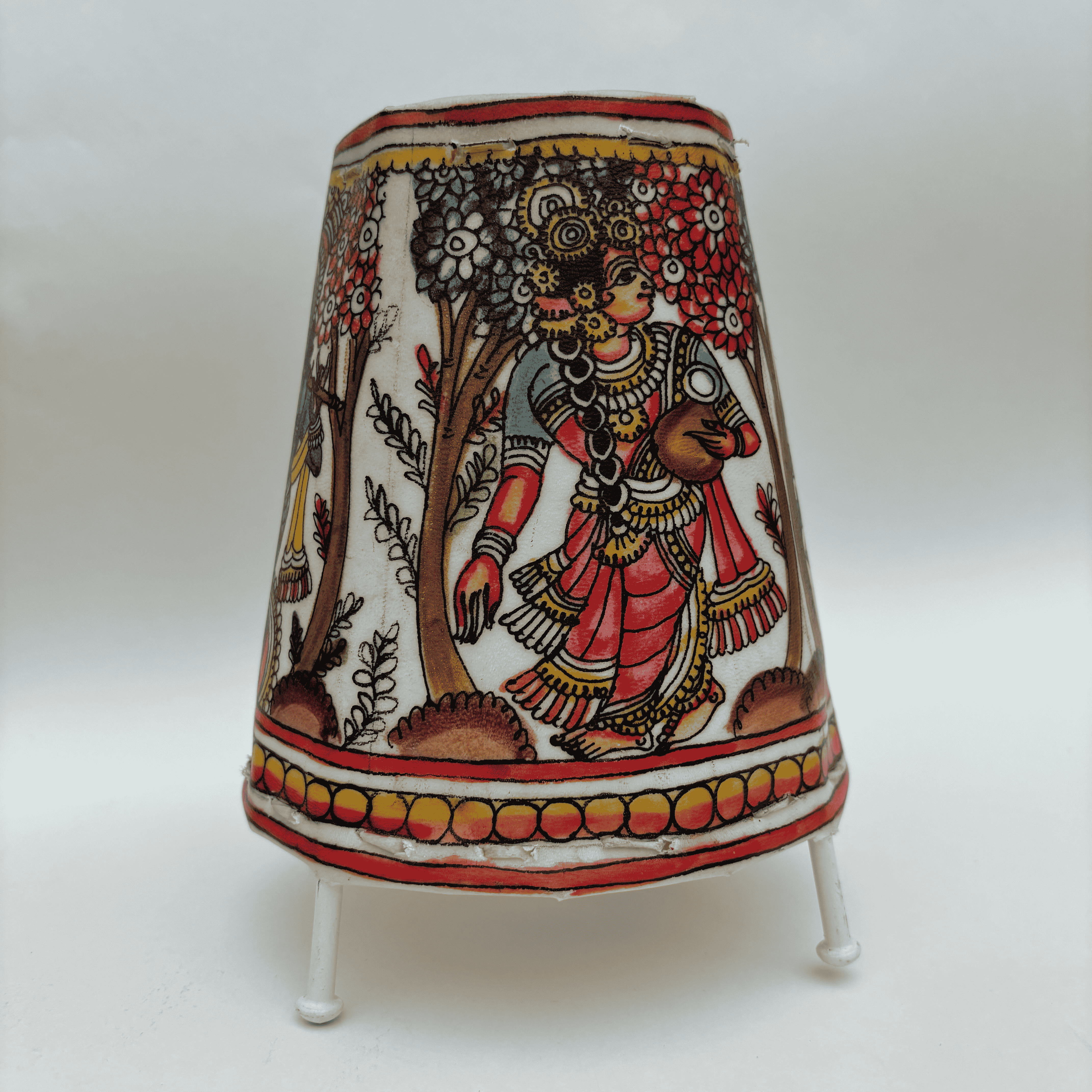 Every detail is hand-drawn and colored with natural and acrylic hues, bringing out rich, vibrant shades that glow beautifully when light passes through. Perfect as a wall hanging, festive décor, or a meaningful gift, this piece carries the soul of traditional Indian storytelling art.
