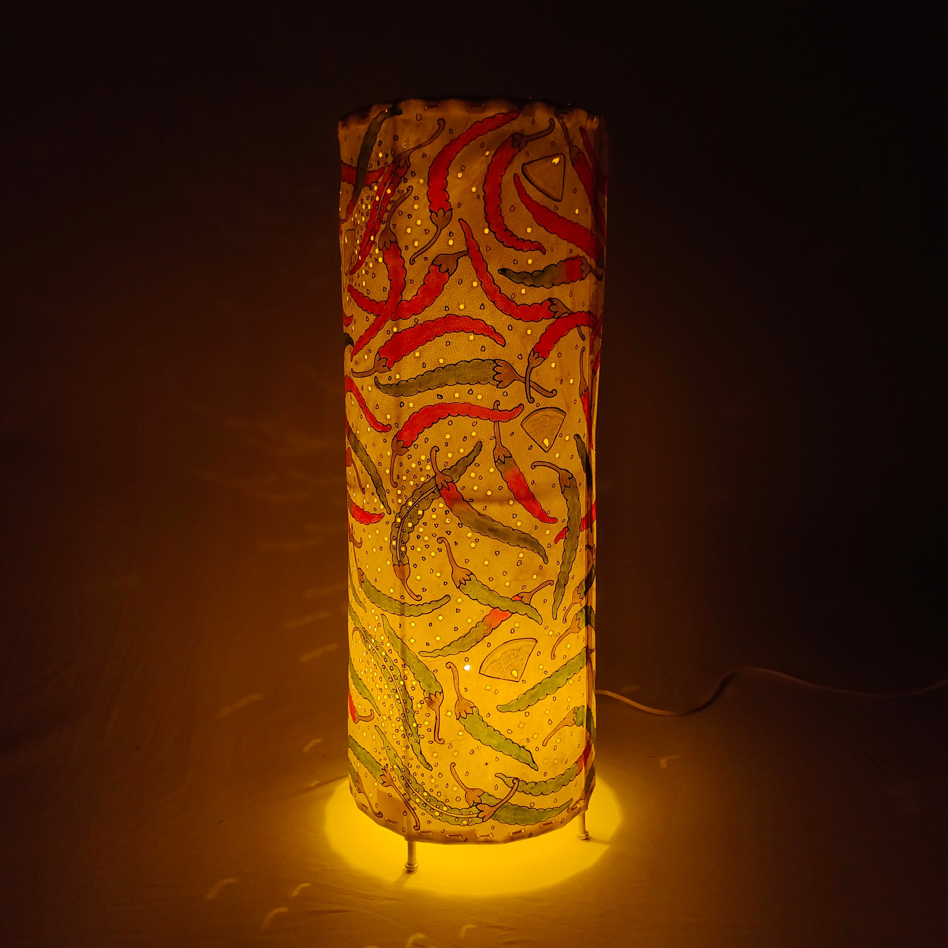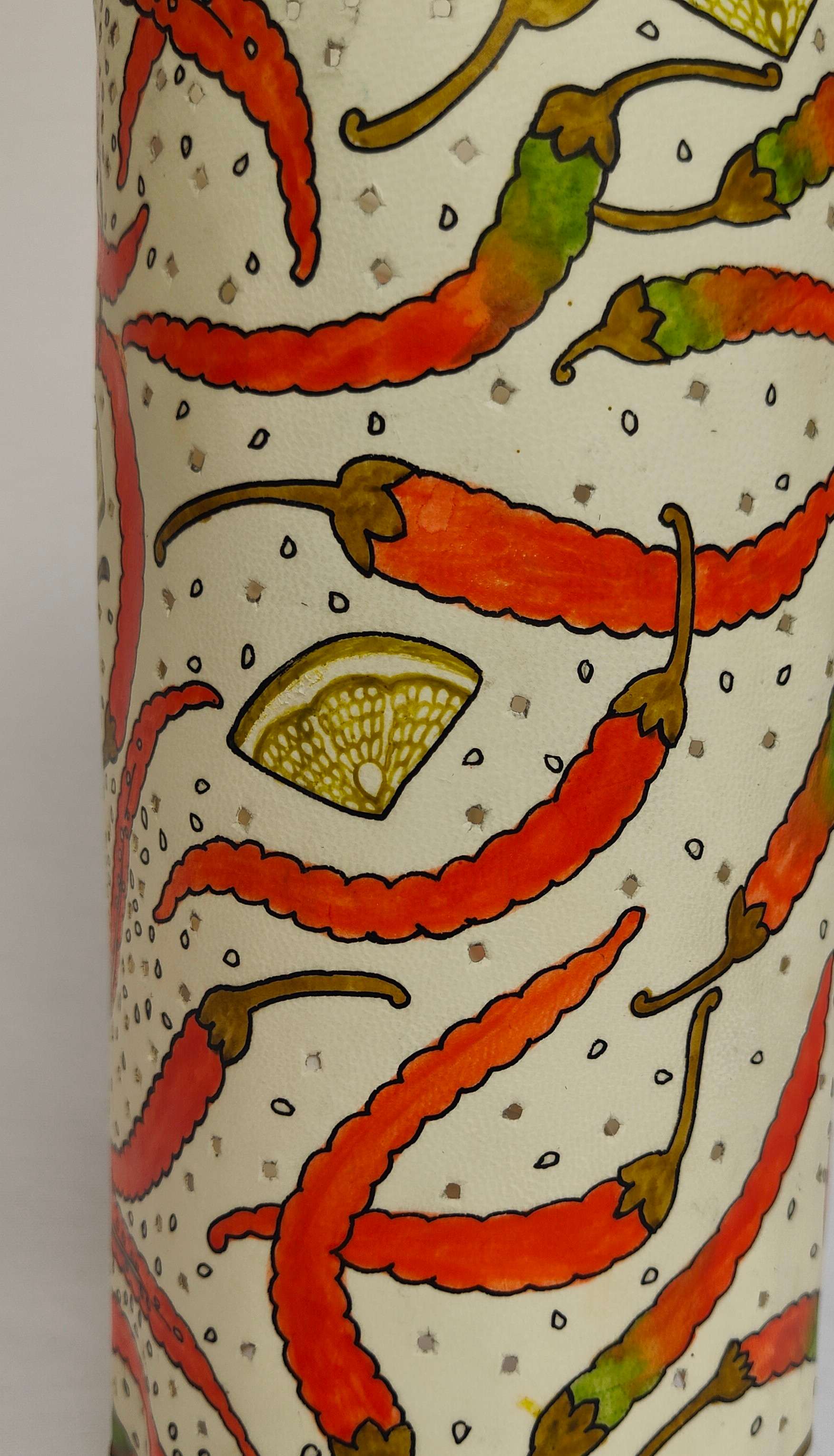 Handcrafted with traditional Tholubommalata leather artistry, this 18-inch round lamp features a vibrant Guntur Mirchi (chili pepper) design — a symbol of spice, energy, and cultural pride from Andhra Pradesh. Made using natural colors and goat leather, this lamp radiates a soft, warm glow that enhances any room’s ambiance.