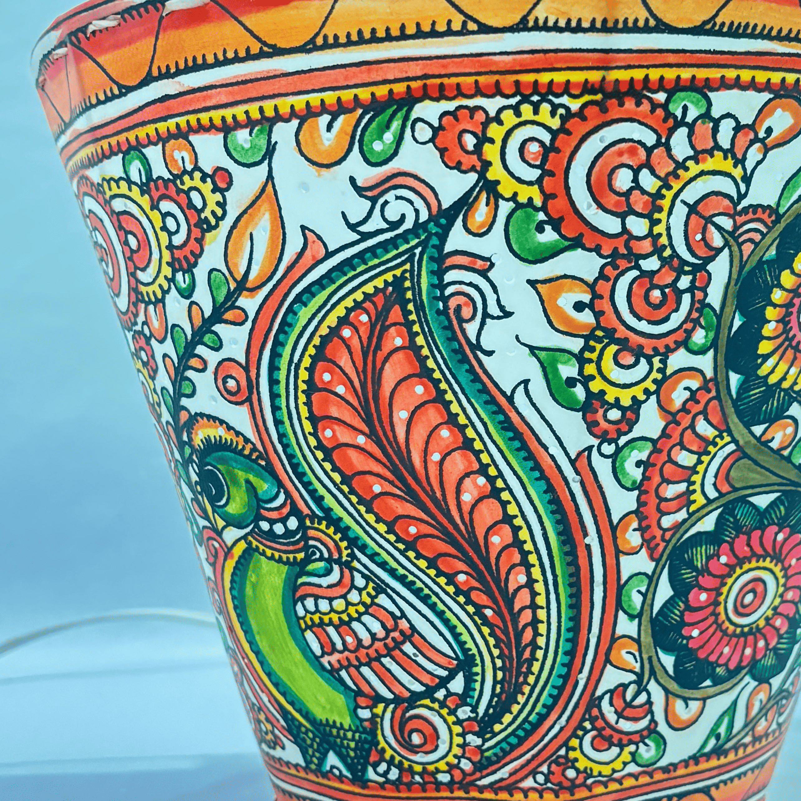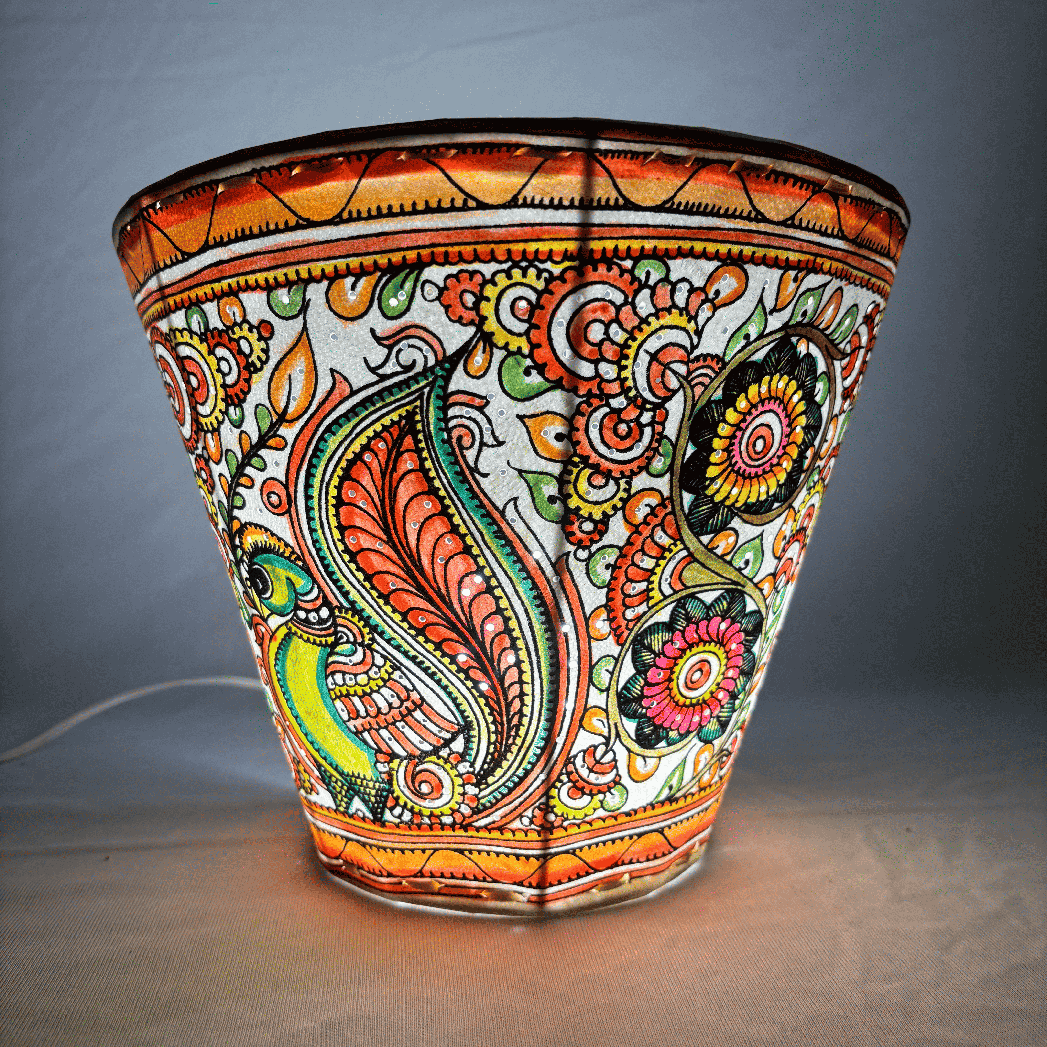 Each piece is meticulously hand-painted with natural colors derived from organic sources, preserving the age-old traditions of leather puppetry. The warm glow of light passing through the delicately treated leather creates a soothing ambiance, while the symbolic peacock — a symbol of grace and beauty — adds charm to your interiors.