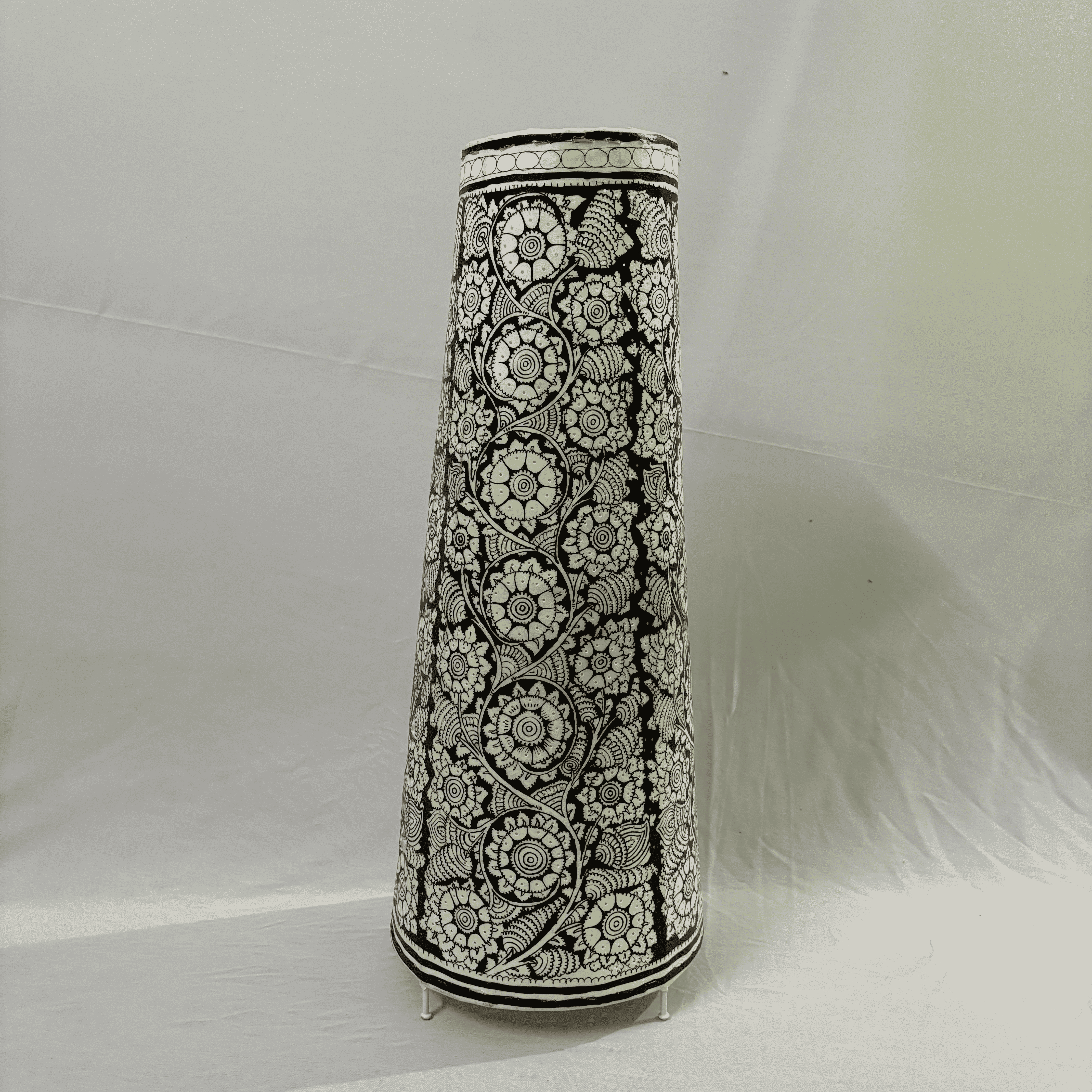 Illuminate your space with the rich heritage of Indian folk art through our Leather Kalamkari Design 25-inch Floor Lamp. Handcrafted in Nimmalakunta, Andhra Pradesh, this elegant floor lamp combines the ancient tradition of Tholubommalata leather puppetry with intricate Kalamkari-inspired motifs, meticulously hand-painted using natural colors derived from flowers, seeds, and minerals.